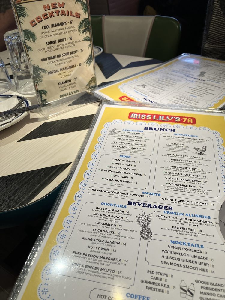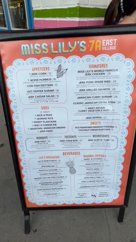 Miss Lily's 7A Cafe is a vibrant Caribbean restaurant located at 109 Avenue A in New York. This cozy spot offers a fusion of traditional and modern Caribbean flavors with a lively atmosphere. The menu features a variety of brunch options like Breakfast Roti with jerk pork sausage and Classic Jamaican Oxtail Stew. Their non-alcoholic beverages include Ting Jamaican grapefruit soda and TopoChico Sparkling Water.